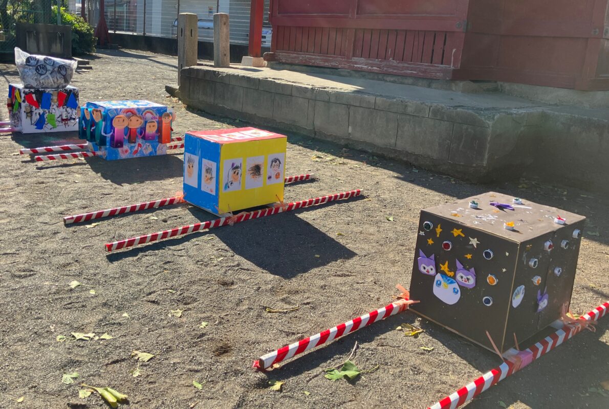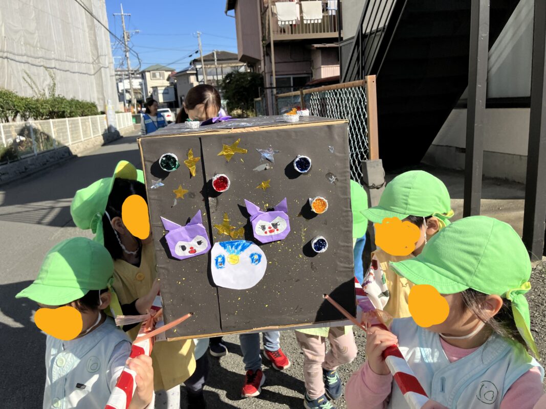 2歳児は可愛らしいオバケをモチーフに、3歳児は自分達の人形を作って手を繋いで仲の良さを表現、4歳児は大好きな電車に見立て自分達で書いた似顔絵を貼り、乗車してるお神輿、5歳児は子ども達の好きなキャラクターやキラキラした宝石、星を詰め合わせたお神輿を作りました🎵それぞれのクラスの個性が出ていた可愛らしいお神輿が出来上がっていました。