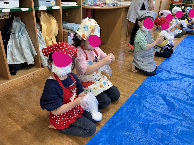 生地を揉んだ後は、足で踏んで薄く伸ばしていきます。好きな歌を歌ったり、友だちと手を繋ぎながら踏んだりと、楽しい雰囲気の中で行うことが出来ました。
